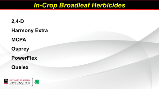 <BR>2,4-D <BR>Harmony Extra <BR>MCPA <BR>Osprey <BR>PowerFlex <BR>Quelex	<BR>In-Crop Broadleaf Herbicides<BR>