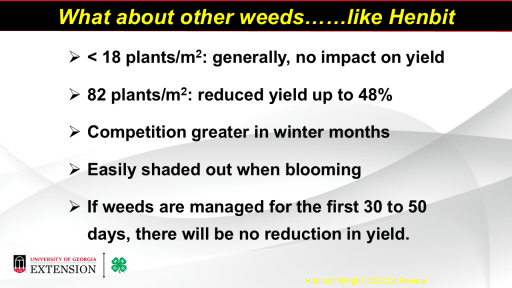 < 18 plants/m2: generally, no impact on yield <BR>82 plants/m2: reduced yield up to 48% <BR>Competition greater in winter months <BR>Easily shaded out when blooming <BR>If weeds are managed for the first 30 to 50 days, there will be no reduction in yield.<BR>Hannah Wright 2022 Lit Review<BR>What about other weeds……like Henbit<BR>