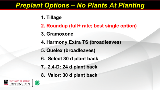 <BR>		1. Tillage 		 <BR>		2. Roundup (full+ rate; best single option)  <BR>		3. Gramoxone  <BR>		4. Harmony Extra TS (broadleaves) <BR>		5. Quelex (broadleaves) <BR>		6.  Select 30 d plant back  <BR>		7.  2,4-D: 24 d plant back  <BR>		8.  Valor: 30 d plant back<BR>Preplant Options – No Plants At Planting<BR>