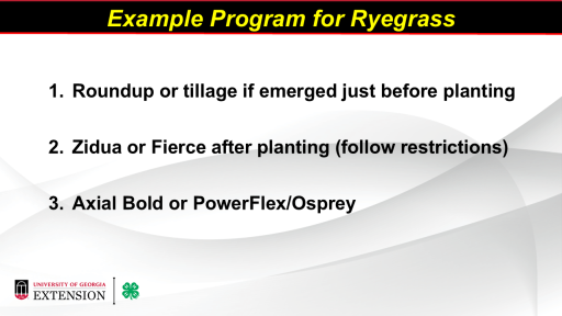 Example Program for Ryegrass<BR>Roundup or tillage if emerged just before planting <BR>Zidua or Fierce after planting (follow restrictions) <BR>Axial Bold or PowerFlex/Osprey<BR>