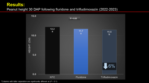 Results: <BR>Peanut height 30 DAP following fluridone and trifludimoxazin (2022-2023)<BR>P = 0.034<BR>*Columns with letter separation are significantly different at (P < 0.1)<BR>P = 0.03<BR>