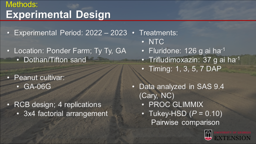 Methods: <BR>Experimental Design<BR>Experimental Period: 2022 – 2023 <BR> <BR>Location: Ponder Farm; Ty Ty, GA <BR>Dothan/Tifton sand  <BR> <BR>Peanut cultivar:  <BR>GA-06G <BR> <BR>RCB design; 4 replications <BR>3x4 factorial arrangement <BR>Treatments: <BR>NTC <BR>Fluridone: 126 g ai ha-1 <BR>Trifludimoxazin: 37 g ai ha-1 <BR>Timing: 1, 3, 5, 7 DAP <BR> <BR>Data analyzed in SAS 9.4 (Cary, NC) <BR>PROC GLIMMIX <BR>Tukey-HSD (P = 0.10) <BR>Pairwise comparison<BR>