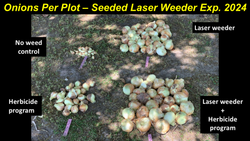Onions Per Plot – Seeded Laser Weeder Exp. 2024<BR>No weed control<BR>Herbicide program<BR>Laser weeder<BR>Laser weeder <BR>+ <BR>Herbicide program<BR>