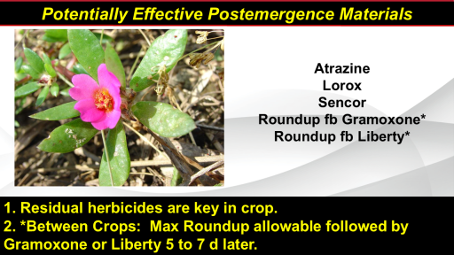 Atrazine <BR>Lorox <BR>Sencor <BR>Roundup fb Gramoxone* <BR>Roundup fb Liberty* <BR>1. Residual herbicides are key in crop. <BR>2. *Between Crops:  Max Roundup allowable followed by Gramoxone or Liberty 5 to 7 d later.<BR>Potentially Effective Postemergence Materials<BR>