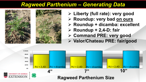 Ragweed Parthenium – Generating Data<BR>Liberty (full rate): very good <BR>Roundup: very bad on ours <BR>Roundup + dicamba: excellent <BR>Roundup + 2,4-D: fair <BR>Command PRE: very good <BR>Valor/Chateau PRE: fair/good<BR>4” <BR>7” <BR>10” <BR>RU + 2,4D<BR>RU + dicamba<BR>RU + 2,4D<BR>RU + dicamba<BR>RU + 2,4D<BR>RU + dicamba<BR>Ragweed Parthenium Size <BR>