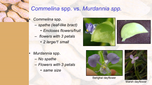 Commelina spp. vs. Murdannia spp.<BR>Commelina spp. <BR>spathe (leaf-like bract) <BR>Encloses flowers/fruit <BR> flowers with 3 petals <BR>2 large/1 small <BR> <BR>Murdannia spp. <BR>No spathe <BR>Flowers with 3 petals <BR>same size<BR>Benghal dayflower<BR>Marsh dayflower<BR>