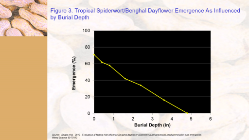 Figure 3. Tropical Spiderwort/Benghal Dayflower Emergence As Influenced by Burial Depth <BR>Source:  Sabila et al.  2012.  Evaluation of factors that influence Benghal dayflower (Commelina benghalensis) seed germination and emergence. <BR>Weed Science 60:75-80.<BR>