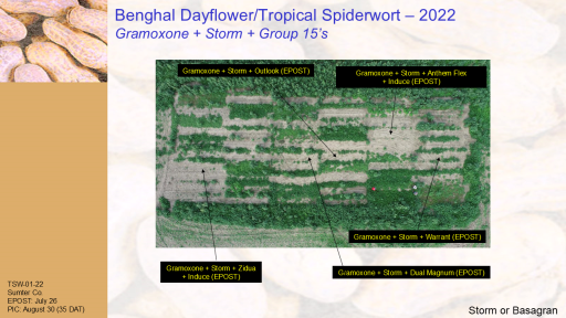 Benghal Dayflower/Tropical Spiderwort – 2022 Gramoxone + Storm + Group 15’s<BR>TSW-01-22 <BR>Sumter Co. <BR>EPOST: July 26 <BR>PIC: August 30 (35 DAT)<BR>Gramoxone + Storm + Dual Magnum (EPOST)<BR>Gramoxone + Storm + Outlook (EPOST)<BR>Gramoxone + Storm + Anthem Flex <BR>+ Induce (EPOST)<BR>Gramoxone + Storm + Zidua  <BR>+ Induce (EPOST)<BR>Gramoxone + Storm + Warrant (EPOST)<BR>Storm or Basagran<BR>