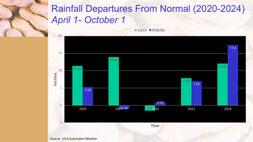 Rainfall Departures From Normal (2020-2024) April 1- October 1<BR>Source: UGA Automated Weather <BR>