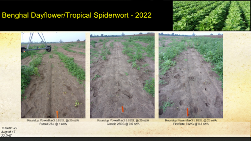 Benghal Dayflower/Tropical Spiderwort - 2022<BR>TSW-01-22 <BR>August 17 <BR>22 DAT<BR>Roundup PowerMax3 5.88SL @ 25 oz/A <BR>Pursuit 2SL @ 4 oz/A<BR>Roundup PowerMax3 5.88SL @ 25 oz/A <BR>Classic 25DG @ 0.5 oz/A<BR>Roundup PowerMax3 5.88SL @ 25 oz/A <BR>FirstRate 84WG @ 0.3 oz/A<BR>