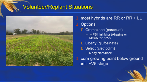 Volunteer/Replant Situations<BR> most hybrids are RR or RR + LL  <BR> Options <BR> Gramoxone (paraquat) <BR> + PSII Inhibitor (Atrazine or Metribuzin)???? <BR> Liberty (glufosinate) <BR> Select (clethodim) <BR>6 day plant-back <BR> corn growing point below ground until ~V5 stage<BR>