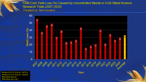 Field Corn Yield Loss (%) Caused by Uncontrolled Weeds in UGA Weed Science Research Trials (2007-2024) Treated vs. Non-treated <BR>200 Bu/A X 0.33 X $4.10 = $271/A <BR>250 Bu/A X 0.33 X $4.10 = $338/A <BR>What about harvest? <BR>What about next year?<BR>