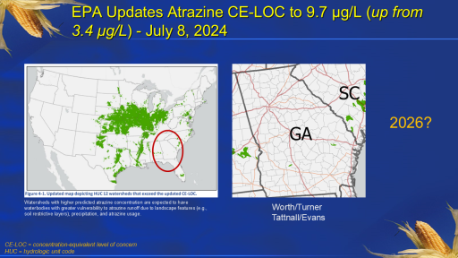 EPA Updates Atrazine CE-LOC to 9.7 µg/L (up from 3.4 µg/L) - July 8, 2024  <BR>CE-LOC = concentration-equivalent level of concern <BR>HUC = hydrologic unit code<BR>2026?<BR>Worth/Turner <BR>Tattnall/Evans<BR>Watersheds with higher predicted atrazine concentration are expected to have waterbodies with greater vulnerability to atrazine runoff due to landscape features (e.g., soil restrictive layers), precipitation, and atrazine usage.<BR>