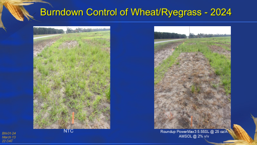Burndown Control of Wheat/Ryegrass - 2024<BR>BN-01-24 <BR>March 13 <BR>22 DAT<BR>NTC<BR>Roundup PowerMax3 5.55SL @ 25 oz/A <BR>AMSOL @ 2% v/v<BR>
