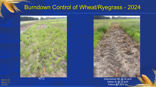 Burndown Control of Wheat/Ryegrass - 2024<BR>BN-01-24 <BR>March 13 <BR>22 DAT<BR>NTC<BR>Gramoxone 3SL @ 32 oz/A <BR>Aatrex 4L @ 32 oz/A <BR>Induce @0.25% v/v<BR>