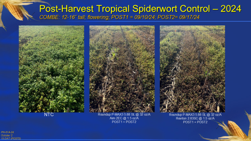 Post-Harvest Tropical Spiderwort Control – 2024 COMBE: 12-16” tall; flowering; POST1 = 09/10/24; POST2= 09/17/24<BR>PH-01A-24 <BR>October 2 <BR>15 DAT (POST2)<BR>NTC<BR>Roundup P-MAX3 5.88 SL @ 32 oz/A <BR>Aim 2EC @ 1.5 oz/A <BR>POST1 + POST2<BR>Roundup P-MAX3 5.88 SL @ 32 oz/A <BR>Reviton 2.83SC @ 1.5 oz/A <BR>POST1 + POST2<BR>