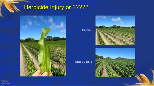 Herbicide Injury or ?????<BR>After 30 lbs S<BR>Before<BR>T. Price <BR>April 2024<BR>