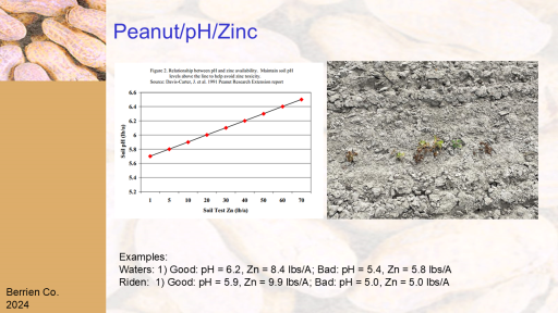 Peanut/pH/Zinc<BR>Examples:  <BR>Waters: 1) Good: pH = 6.2, Zn = 8.4 lbs/A; Bad: pH = 5.4, Zn = 5.8 lbs/A  <BR>Riden:  1) Good: pH = 5.9, Zn = 9.9 lbs/A; Bad: pH = 5.0, Zn = 5.0 lbs/A<BR>Berrien Co. <BR>2024<BR>