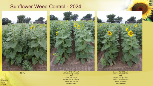 Sunflower Weed Control - 2024<BR>SN-01-24 <BR>July 1  <BR>54 DAP<BR>NTC<BR>Spartan 4F @ 3.75 oz/A <BR>Zidua 4.17SC @ 2.5 oz/A <BR>PRE <BR>Cadre 2AS 4 oz/A <BR>Zidua 4.17SC @ 2.5 oz/A <BR>Induce @ 0.25% v/v <BR>POST (28 DAP)<BR>Spartan 4F @ 3.75 oz/A <BR>Zidua 4.17SC @ 2.5 oz/A <BR>PRE <BR>Beyond 1AS @ 4 oz/A <BR>Zidua 4.17SC @ 2.5 oz/A <BR>Induce  0.25% v/v <BR>POST (28 DAP)<BR>