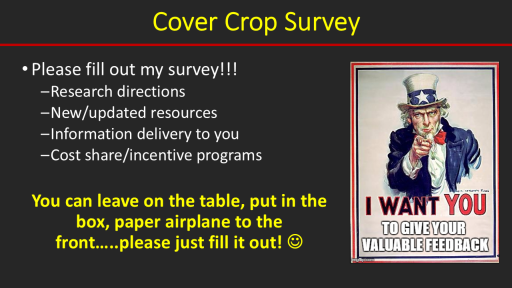 Cover Crop Survey<BR>Please fill out my survey!!! <BR>Research directions <BR>New/updated resources <BR>Information delivery to you <BR>Cost share/incentive programs <BR> <BR>You can leave on the table, put in the box, paper airplane to the front…..please just fill it out! ?  <BR> <BR>