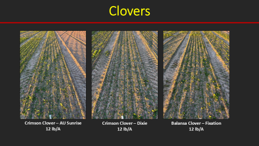 Clovers<BR>Crimson Clover – AU Sunrise <BR>12 lb/A<BR>Crimson Clover – Dixie <BR>12 lb/A<BR>Balansa Clover – Fixation <BR>12 lb/A<BR>