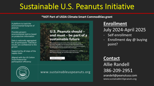 Sustainable U.S. Peanuts Initiative<BR>Enrollment  <BR>July 2024-April 2025 <BR>Self enrollment <BR>Enrollment day @ buying point?<BR>Contact <BR>Allie Randell <BR>386-209-2951 <BR>arandell@peanutusa.com <BR>www.sustainableUSpeanuts.org<BR>*NOT Part of USDA Climate Smart Commodities grant<BR>