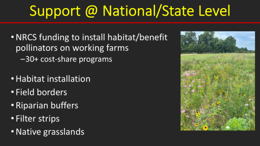NRCS funding to install habitat/benefit pollinators on working farms <BR>30+ cost-share programs <BR> <BR>Habitat installation <BR>Field borders <BR>Riparian buffers <BR>Filter strips  <BR>Native grasslands <BR> <BR> <BR>Support @ National/State Level<BR>