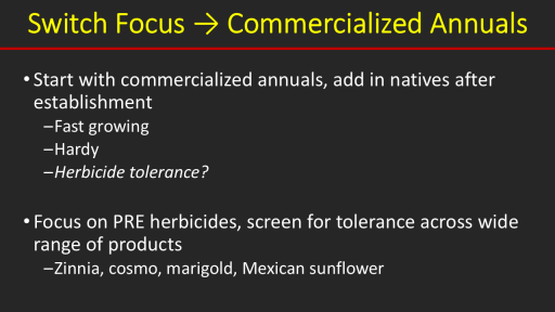 Start with commercialized annuals, add in natives after establishment <BR>Fast growing <BR>Hardy <BR>Herbicide tolerance? <BR> <BR>Focus on PRE herbicides, screen for tolerance across wide range of products <BR>Zinnia, cosmo, marigold, Mexican sunflower  <BR> <BR> <BR>Switch Focus ? Commercialized Annuals<BR>