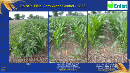 Enlist™ Field Corn Weed Control - 2025<BR>CN-04-25 <BR>May 8 <BR>29 DAT<BR>NTC<BR>Liberty Ultra 1.76SL @ 24 oz/A <BR>Enlist One 3.8SL @ 32 oz/A <BR>Dual Magnum 7.62EC @ 16 oz/A <BR>Applied 14 DAP (V3-V4)<BR>Liberty Ultra 1.76SL @ 24 oz/A <BR>Enlist One 3.8SL @ 32 oz/A <BR>Outlook 6EC @ 12.8 oz/A <BR>Applied 14 DAP (V3-V4)<BR>