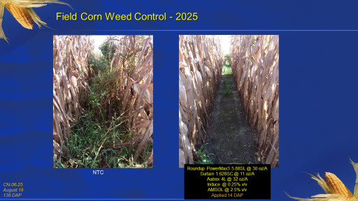 Field Corn Weed Control - 2025<BR>CN-06-25 <BR>August 19 <BR>138 DAP<BR>NTC<BR>Roundup PowerMax3 5.88SL @ 30 oz/A <BR>Surtain 1.628SC @ 11 oz/A <BR>Aatrex 4L @ 32 oz/A <BR>Induce @ 0.25% v/v <BR>AMSOL @ 2.5% v/v <BR>Applied 14 DAP<BR>