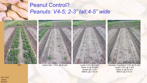 Peanut Control? Peanuts: V4-5; 2-3” tall;4-5” wide<BR>PE-13-25 <BR>June 3  <BR>20 DAT<BR>NTC<BR>Liberty Ultra 1.76SL @ 24 oz/A<BR>Laudis 3.5SC @ 3 oz/A <BR>Aatrex 4L @ 64 oz/A <BR>Agridex @ 1% v/v <BR>AMSOL @ 2.5% v/v<BR>Roundup PowerMax3 5.5SL @ 30 oz/A <BR>Laudis 3.5SC @ 3 oz/A <BR>Aatrex 4L @ 64 oz/A <BR>AMSOL @ 2.5% v/v<BR>
