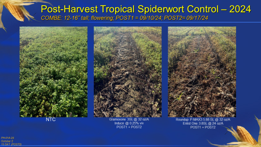 Post-Harvest Tropical Spiderwort Control – 2024 COMBE: 12-16” tall; flowering; POST1 = 09/10/24; POST2= 09/17/24<BR>PH-01A-24 <BR>October 2 <BR>15 DAT (POST2)<BR>NTC<BR>Gramoxone 3SL @ 32 oz/A <BR>Induce @ 0.25% v/v <BR>POST1 + POST2<BR>Roundup P-MAX3 5.88 SL @ 32 oz/A <BR>Enlist One 3.8SL @ 24 oz/A <BR>POST1 + POST2<BR>