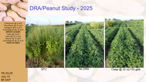 DRA/Peanut Study - 2025<BR>PE-03-25 <BR>July 10 <BR>66 DAP<BR>Gramoxone @ 8 oz/A <BR>Ultra Blazer @ 16 oz/A <BR>Basagran @ 6.4 oz/A <BR>Dual Magnum @ 16 oz/A <BR>EPOST (14 DAP) <BR>Cadre @ 4 oz/A <BR>Cobra @ 12.5 oz/A <BR>Butyrac @ 16 oz/A <BR>Dual Magnum @ 16 oz/A <BR>POST (37 DAP)<BR>NTC<BR>No DRA<BR>Clasp @ 32 oz/100 gals<BR>