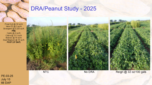 DRA/Peanut Study - 2025<BR>PE-03-25 <BR>July 10 <BR>66 DAP<BR>Prowl H20 @ 32 oz/A <BR>Valor EZ @ 3 oz/A <BR>Strongarm @ 0.225 oz/A <BR>PRE <BR>Cadre @ 4 oz/A <BR>Cobra @ 12.5 oz/A <BR>Butyrac @ 16 oz/A <BR>Dual Magnum @ 16 oz/A <BR>POST (37 DAP)<BR>NTC<BR>No DRA<BR>Reign @ 32 oz/100 gals<BR>