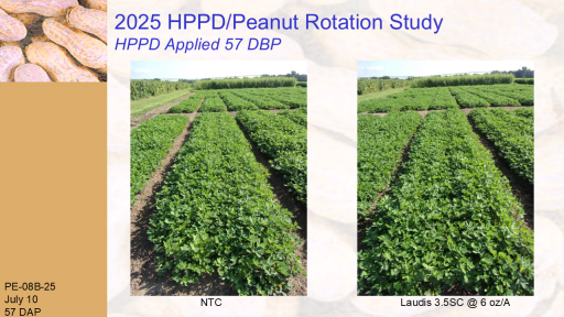 2025 HPPD/Peanut Rotation Study HPPD Applied 57 DBP<BR>PE-08B-25 <BR>July 10 <BR>57 DAP<BR>NTC<BR>Laudis 3.5SC @ 6 oz/A<BR>