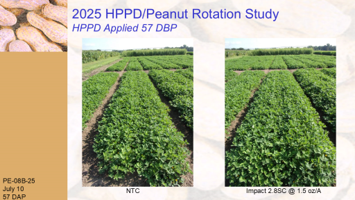 2025 HPPD/Peanut Rotation Study HPPD Applied 57 DBP<BR>PE-08B-25 <BR>July 10 <BR>57 DAP<BR>NTC<BR>Impact 2.8SC @ 1.5 oz/A<BR>