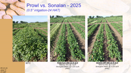 Prowl vs. Sonalan - 2025 (0.5” irrigation-24 HAT)<BR>PE-01-25 <BR>June 11 <BR>37 DAP<BR>NTC<BR>Prowl H20 3.8SC @ 32 oz/A <BR>Valor EZ 4SC @ 3 oz/A <BR>Strongarm 84WG @ 0.225 oz/A <BR>(PRE)<BR>Sonalan HFP 4EC @ 32 oz/A <BR>Valor EZ 4SC @ 3 oz/A <BR>Strongarm 84WG @ 0.225 oz/A <BR>(PRE)<BR>