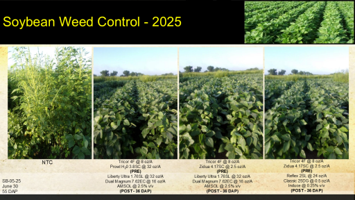Soybean Weed Control - 2025<BR>SB-05-25 <BR>June 30 <BR>55 DAP<BR>NTC<BR>Tricor 4F @ 8 oz/A <BR>Prowl H20 3.8SC @ 32 oz/A <BR>(PRE) <BR>Liberty Ultra 1.76SL @ 32 oz/A <BR>Dual Magnum 7.62EC @ 16 oz/A <BR>AMSOL @ 2.5% v/v <BR>(POST - 36 DAP)<BR>Tricor 4F @ 8 oz/A <BR>Zidua 4.17SC @ 2.5 oz/A <BR>(PRE) <BR>Liberty Ultra 1.76SL @ 32 oz/A <BR>Dual Magnum 7.62EC @ 16 oz/A <BR>AMSOL @ 2.5% v/v <BR>(POST - 36 DAP)<BR>Tricor 4F @ 8 oz/A <BR>Zidua 4.17SC @ 2.5 oz/A <BR>(PRE) <BR>Reflex 2SL @ 24 oz/A <BR>Classic 25DG @ 0.5 oz/A <BR>Induce @ 0.25% v/v <BR>(POST - 36 DAP)<BR>