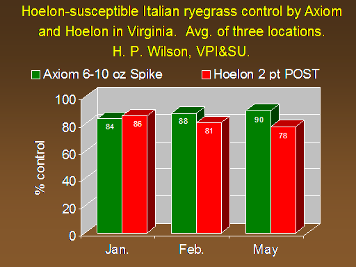 Hoelon-susceptible Italian ryegrass control by Axiomand Hoelon in Virginia.  Avg. of three locations.  H. P. Wilson, VPI&SU.<BR>