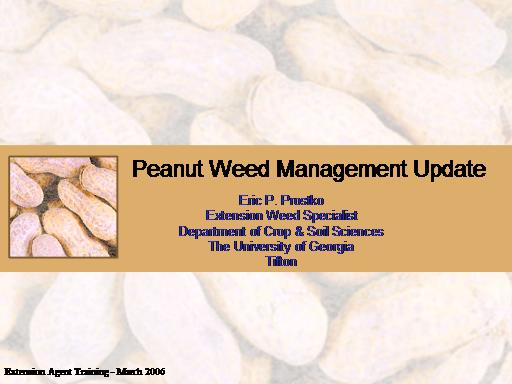 Peanut Weed Management Update<BR>Eric P. Prostko <BR>Extension Weed Specialist <BR>Department of Crop & Soil Sciences <BR>The University of Georgia <BR>Tifton<BR>Extension Agent Training - March 2006<BR>