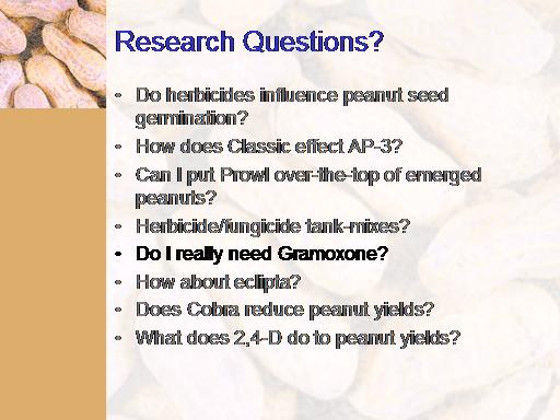 Research Questions?<BR>Do herbicides influence peanut seed germination? <BR>How does Classic effect AP-3? <BR>Can I put Prowl over-the-top of emerged peanuts? <BR>Herbicide/fungicide tank-mixes? <BR>Do I really need Gramoxone? <BR>How about eclipta? <BR>Does Cobra reduce peanut yields? <BR>What does 2,4-D do to peanut yields? <BR>