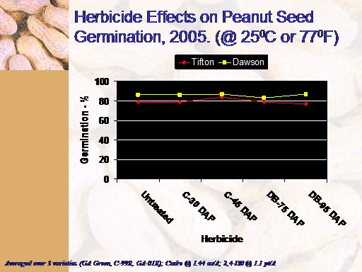 Herbicide Effects on Peanut Seed Germination, 2005. (@ 250C or 770F)<BR>Averaged over 3 varieties (GA Green, C-99R, GA-01R); Cadre @ 1.44 oz/A; 2,4-DB @ 1.1 pt/A<BR>