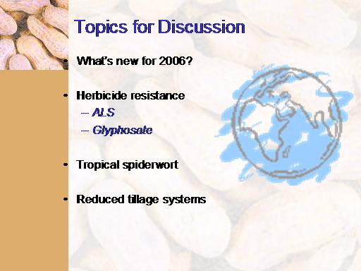 Topics for Discussion<BR>What’s new for 2006? <BR> <BR>Herbicide resistance <BR>ALS <BR>Glyphosate <BR> <BR>Tropical spiderwort <BR> <BR>Reduced tillage systems <BR> <BR>