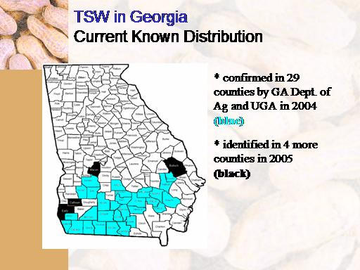 TSW in Georgia Current Known Distribution<BR>* confirmed in 29 counties by GA Dept. of Ag and UGA in 2004 (blue)<BR>* identified in 4 more <BR>counties in 2005  <BR>(black) <BR>	<BR>