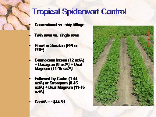 Tropical Spiderwort Control<BR>Conventional vs. strip-tilllage <BR> <BR>Twin rows vs. single rows <BR> <BR>Prowl or Sonalan (PPI or PRE) <BR> <BR>Gramoxone Inteon (12 oz/A) + Basagran (8 oz/A) + Dual Magnum (11-16 oz/A) <BR> <BR>Followed by Cadre (1.44 oz/A) or Strongarm (0.45 oz/A) + Dual Magnum (11-16 oz/A) <BR> <BR>Cost/A = ~$44-51 <BR> <BR> <BR>