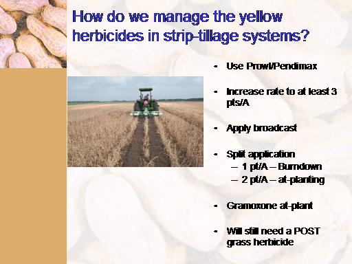 How do we manage the yellow herbicides in strip-tillage systems?<BR>Use Prowl/Pendimax <BR> <BR>Increase rate to at least 3 pts/A <BR> <BR>Apply broadcast <BR> <BR>Split application <BR>1 pt/A – Burndown <BR>2 pt/A – at-planting <BR> <BR>Gramoxone at-plant <BR> <BR>Will still need a POST grass herbicide<BR>
