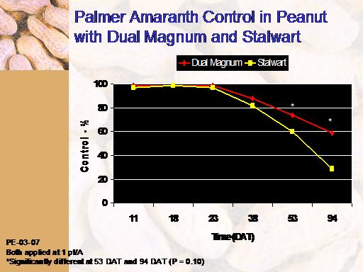 Palmer Amaranth Control in Peanut with Dual Magnum and Stalwart<BR>PE-03-07 <BR>Both applied at 1 pt/A <BR>*Significantly different at 53 DAT and 94 DAT (P = 0.10)<BR>*<BR>*<BR>