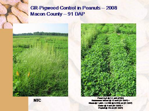 GR-Pigweed Control in Peanuts – 2008 Macon County – 91 DAP<BR>NTC<BR>Prowl H2O @ 2.1 pt/A (PRE) <BR>Gramoxone Inteon @ 12 oz/A (21 DAP) + <BR>Storm @ 1 pt/A + LI-700 @ 0.25% v/v (21 DAP) <BR>Cadre @ 4 ozA (41 DAP) + <BR>Peptoil @ 1% v/v (41 DAP) <BR>