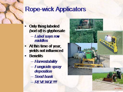 Rope-wick Applicators<BR>Only thing labeled (sort of) is glyphosate <BR>Label says row middles <BR>At this time of year, yields not influenced <BR>Benefits <BR>Harvestability <BR>Fungicide spray deposition <BR>Seed bank <BR>REVENGE!!!!<BR>