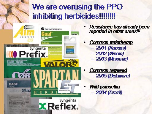 We are overusing the PPO inhibiting herbicides!!!!!!!!<BR>Resistance has already been reported in other areas!!! <BR> <BR>Common waterhemp <BR>2001 (Kansas) <BR>2002 (Illinois) <BR>2003 (Missouri) <BR> <BR>Common ragweed <BR>2005 (Delaware) <BR> <BR>Wild poinsettia <BR>2004 (Brazil) <BR> <BR> <BR> <BR>
